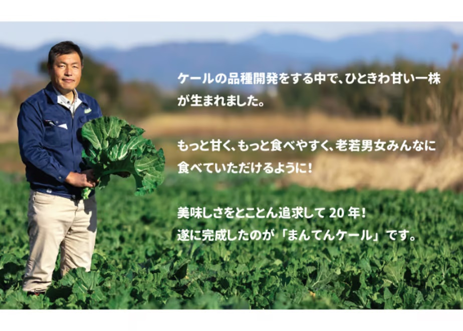 弊社は明治40年創業以来、静岡でアブラナ科を中心とした野菜の品種改良を行っています。このたび、10数年かけて作り上げたケール品種が「まんてんケール」です。