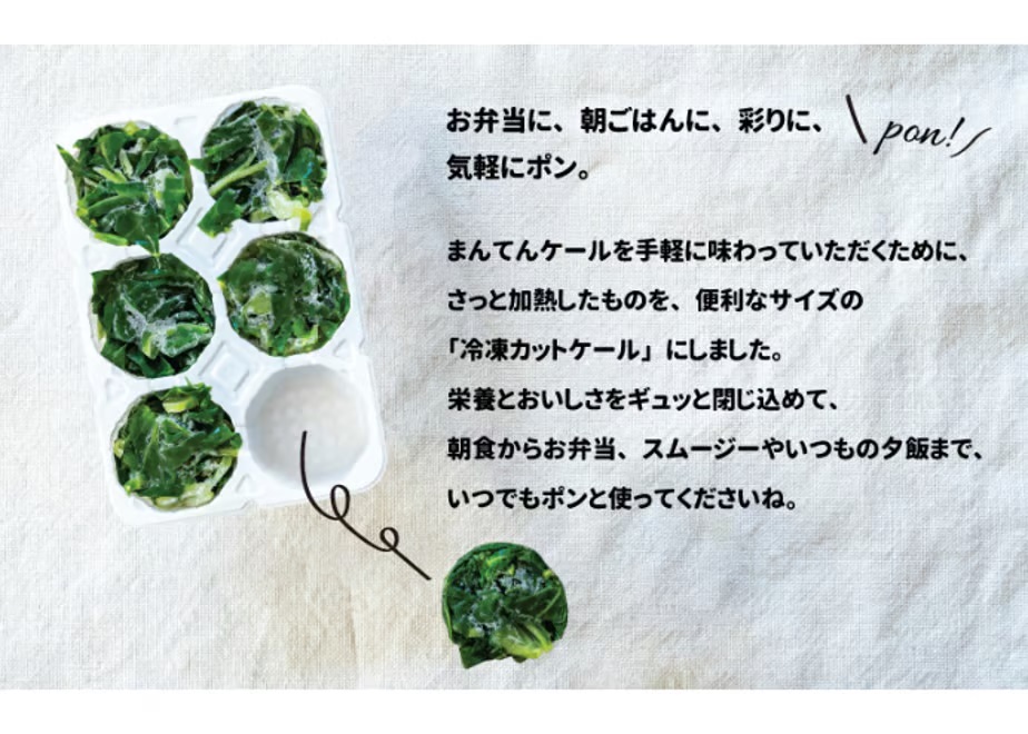また、小分け1ポーションのケールと各種果物や豆乳、ヨーグルト、牛乳等で味に変化を与えながらスムージーを作り、毎日続けられます。