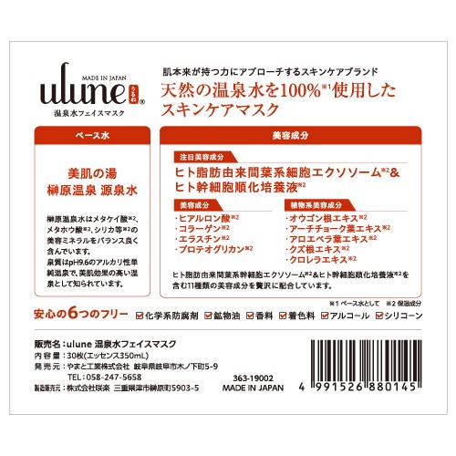 【岐阜】【やまと工業】ulune 温泉水フェイスマスク 30枚入り【三重 榊原温泉水使用】