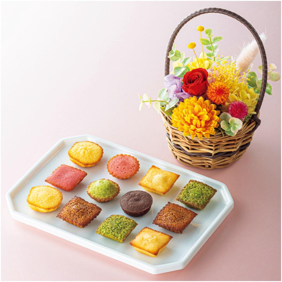 プティガトーアソルティ(フィナンシェ・マドレーヌ・キャラメル・抹茶 各2、ピスターシュ、フランボワーズ、ミルクチョコ、フレーズ)、プリザーブドフラワー((バラ、千日紅、アジサイ、カスミソウ)、ドライフラワー、造花、バスケット:幅約11×高さ約17cm)