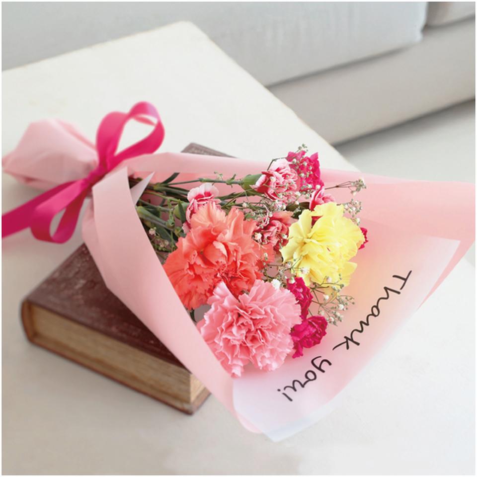 ふんわりと咲くカーネーションとカスミソウのブーケ。ラッピングに添えたメッセージが、感謝の気持ちを伝えてくれます。