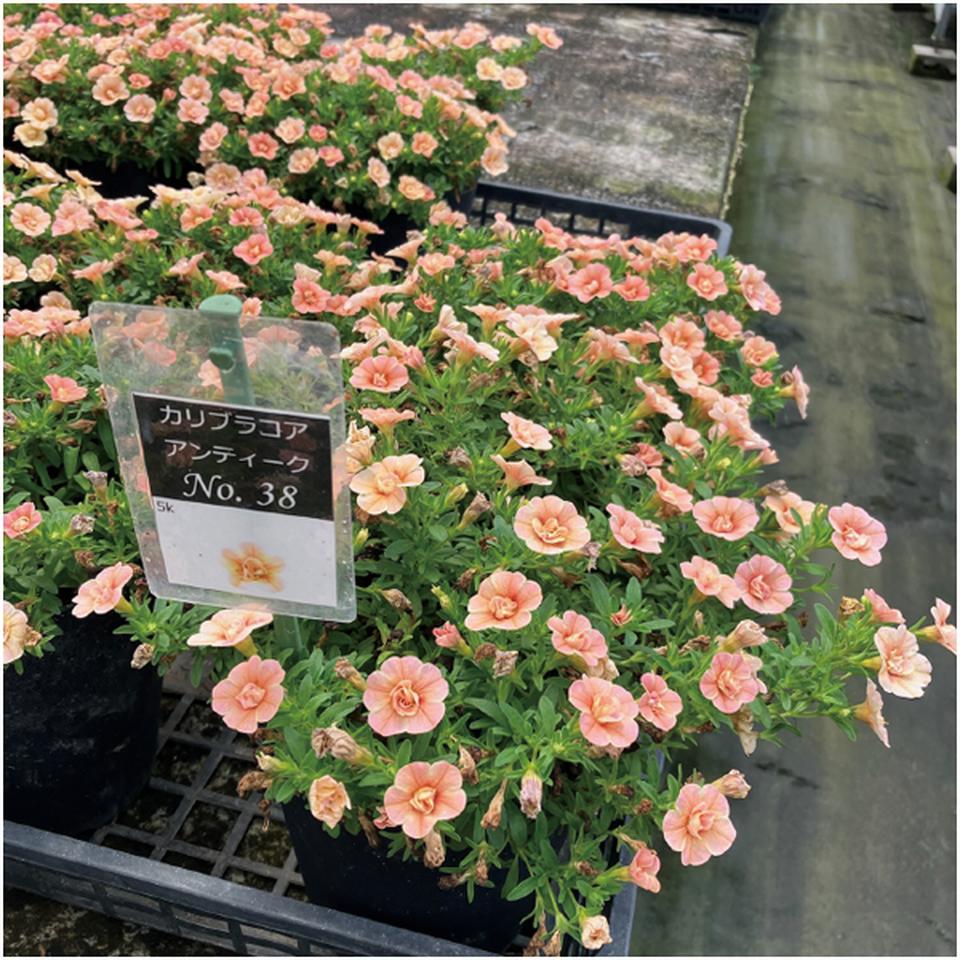 ニュアンスカラーのオレンジのカリブラコアです。八重咲きが愛らしく、開花期間も長く秋まで楽しめる鉢花です。