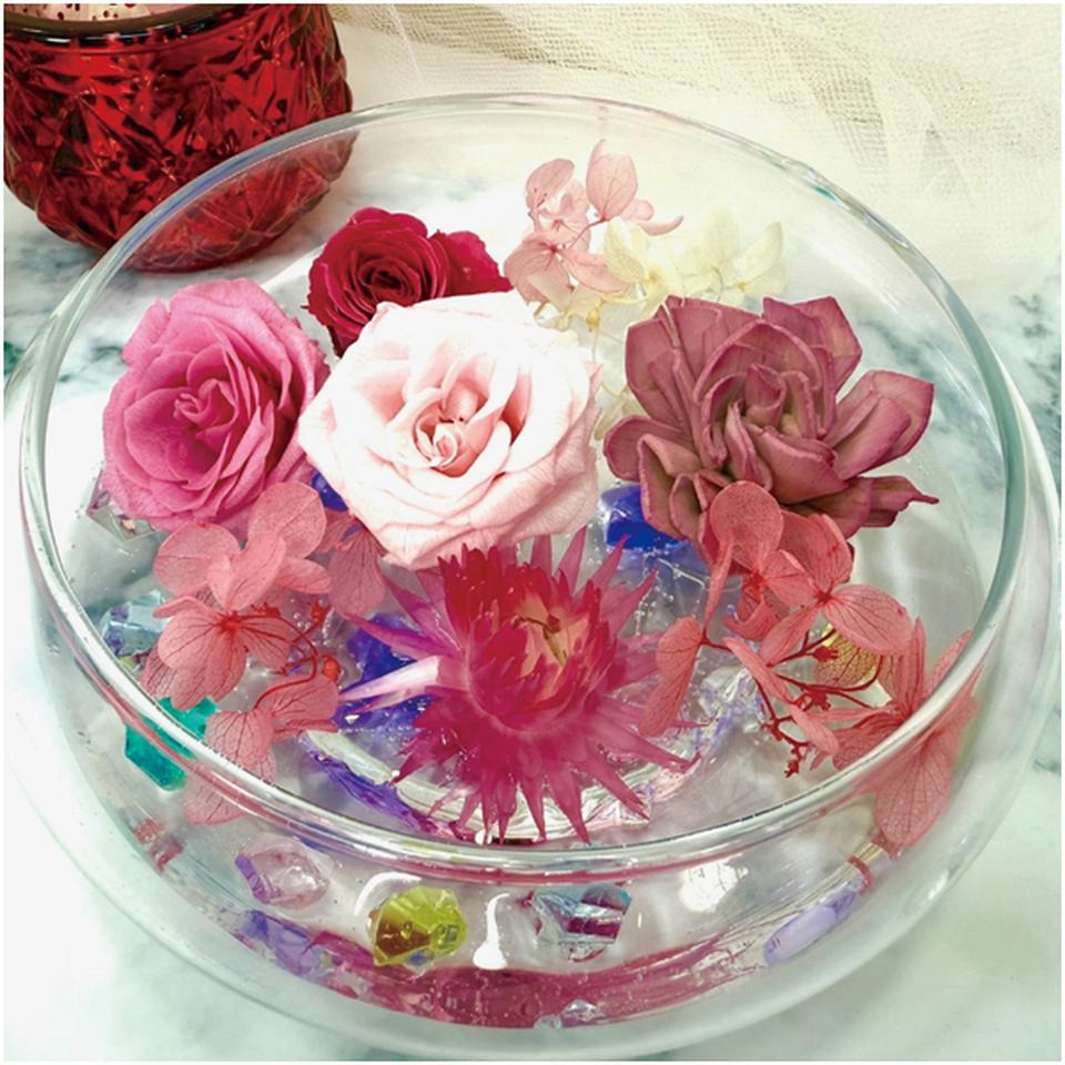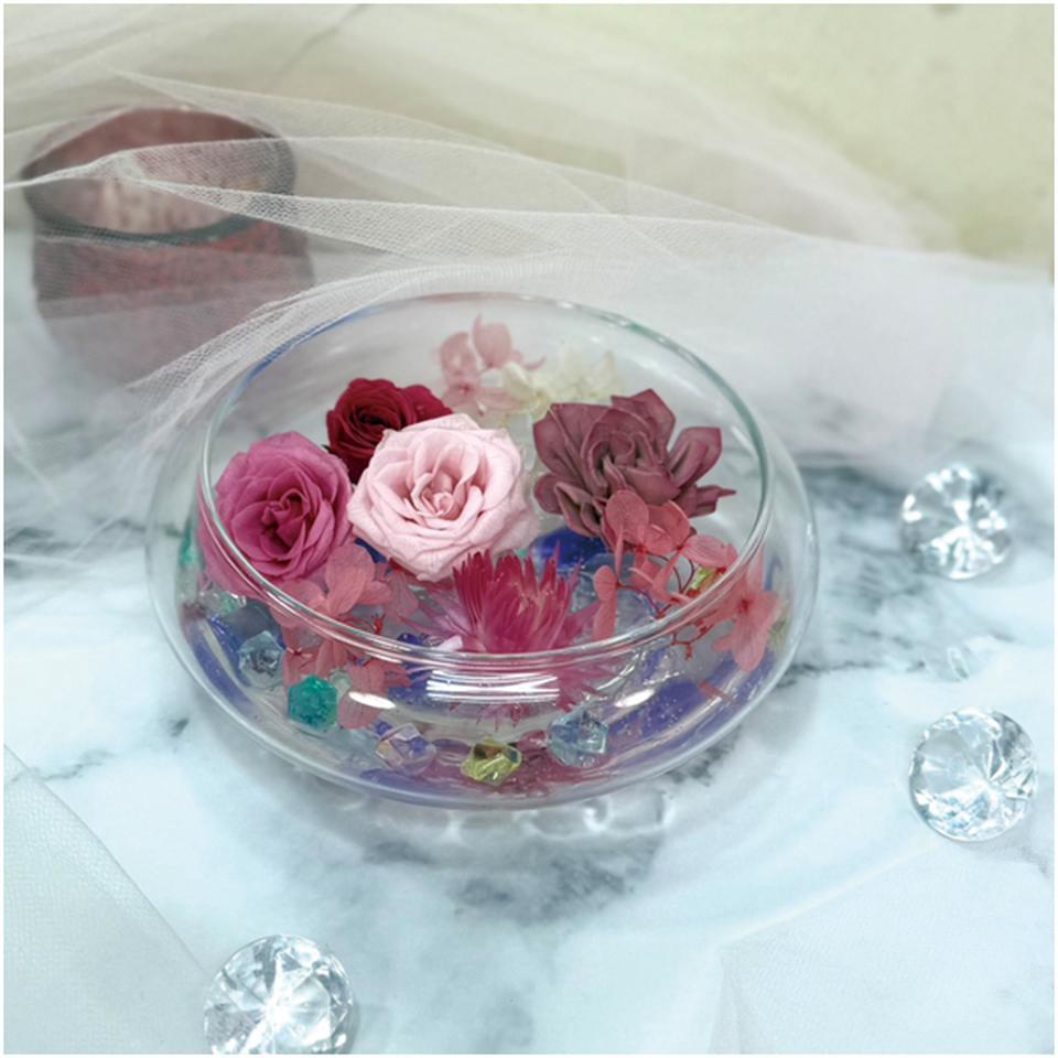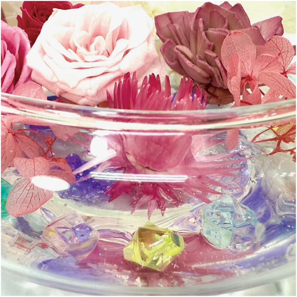 爽やかなジェルを使用したアレンジ。口の広いガラス花器にお花を浮かべたような華やかなアレンジです。