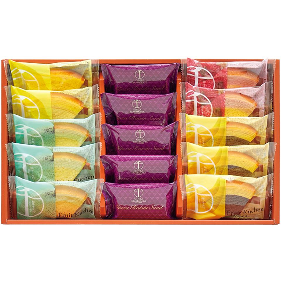 銀座フルーツクーヘン(イチゴ&ミルク・レモン&はちみつ 各2、メロン&ミルク・バナナ&チョコ 各3)、銀座レーズンサンド5