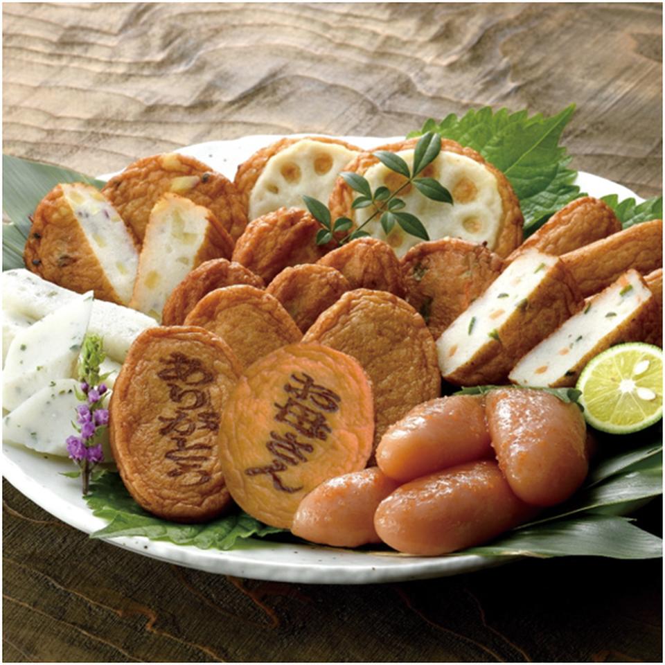 ごぼう天4、棒天3、しそ棒天3、さつまいも天2、れんこん揚2、野菜天2、上揚4(内 お母さん・ありがとう焼印 各1)、福さ屋明太子175g