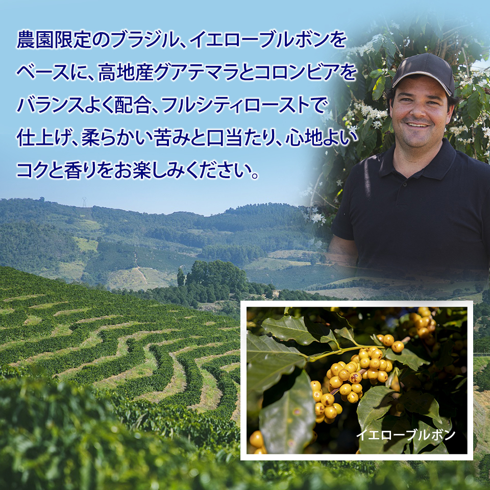 農園限定のブラジル、イエローブルボンをベースに、高地産グアテマラとコロンビアをバランスよく配合、フルシティ―ローストで仕上げ、柔らかな苦みと口当たりの味わいです。