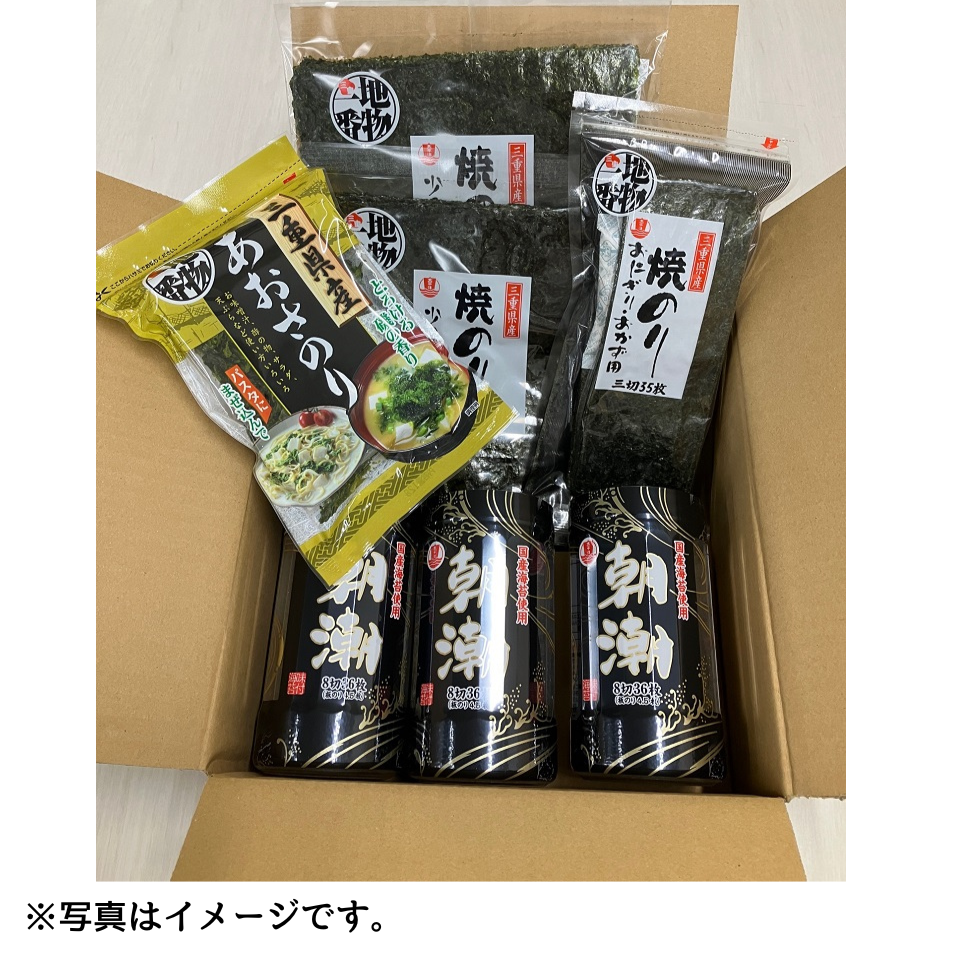 味付海苔3個、三重県産焼海苔全型(7枚)2個、三重県産焼海苔3ツ切(35枚)1個、三重県産あおさのり1個